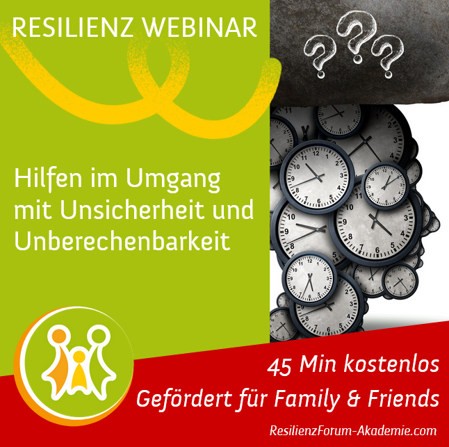 In diesem Family & Friends Resilienz-Webinar gibt mit der Resilienz-Expertin Ella Gabriele Amann erfährst Du, warum Menschen schlecht mit Unsicherheit und Unplanbarkeit umgehen können. Du verstehst wie Dir Improvisationstalent und Lernbereitschaft dabei helfen können mit dem Unbekannten besser umzugehen und Du lernst hilfreiche Resilienz-Strategien kennen für mehr Sicherheit und "Planbarkeit" in ungewissen Krisenzeiten.