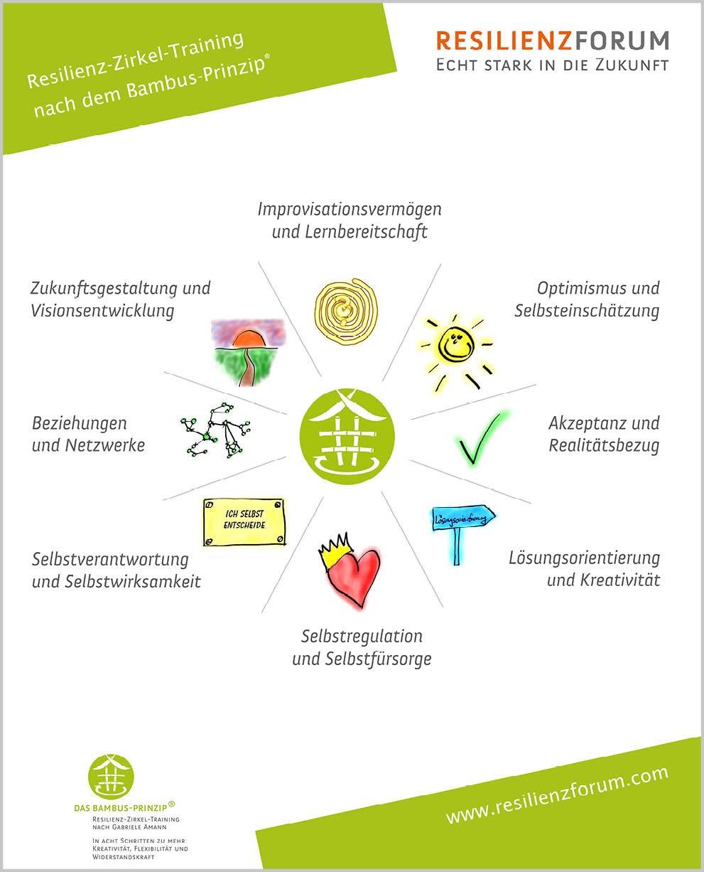 Der RZT® Resilienz-Kompetenz-Zirkel und die Meta-Prinzipien der Resilienz nach dem Bambus-Prinzip® mit/ohne Coachingfragen. Ob zum Einsatz im Coaching oder als Give Away für Deine Klienten und Seminar-Teilnehmenden, die RZT® Postkarten helfen dabei, Deine Arbeit und Deine Arbeitsergebnisse nachhaltig zu verankern und werden zum einfachen Begleiter im Job- und Familienalltag.